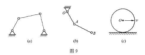 问题 如图9所示,下述质点系各有几个自由度( )。 (1)平面四连杆机构(图9(a))。 (2)在固定铅垂面内运动的双摆(图9(b))。 (3)在平面内沿直线作纯滚动的轮(图9(c))。