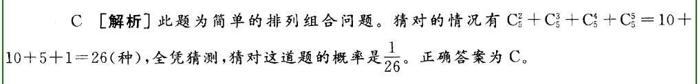 问题 -道多项选择题有A、B、C、D、E 5个备选项,要求从中选出2个或2个以上的选项作为唯 -正确的选项。如果全凭猜测,猜对这道题的概率是( )。