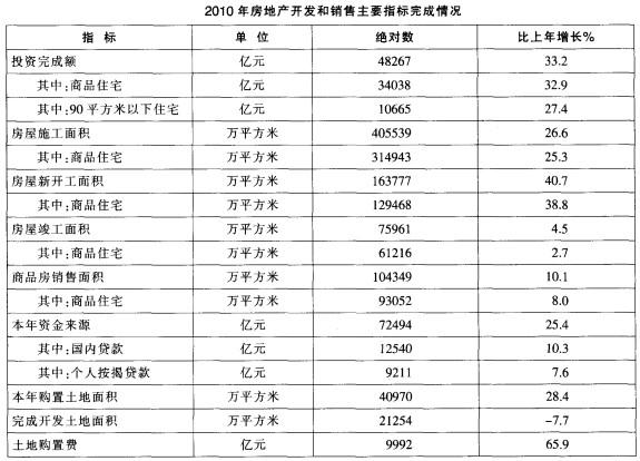 解析 由表格可知,2010年房地产投资额、购置土地面积和房屋新开工面积均是增加的,所以排除A、B、C三项,选择D。