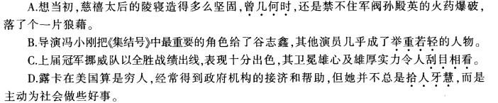 解析 曾几何时:曾:曾经;几何:若干,多少。才有多少时候。指没过多久。对这个词语我们要把握住两点,一是它指“过去”,二是表示“时间短”,运用时这两条件缺一不可。用来修饰慈禧太后的陵寝曾经很坚固,但还是禁不住军阀火药的爆破,既包含了“过去”也包含了“时间短”,当选。举重若轻:比喻能力强,能够轻松地胜任繁重的工作或处理问题。与C项句意不符,排除。刮目相看:指别人已有进步,不能再用老眼光去看他。这个成语是拿一个人的现在与过去相比。而C项,并无此意,应用“另眼相看”。拾人牙慧:牙慧,指别人说过的话。比喻拾取别人的一言半语当作自己的话。与D项句意不符,排除。
