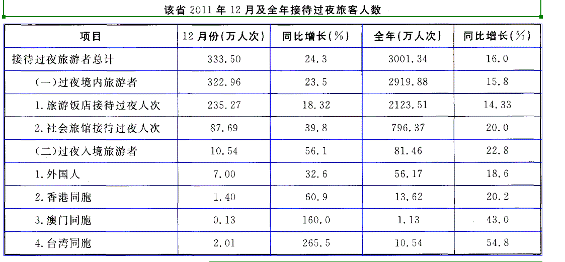 2011年某省接待过夜游客总量再次实现突破,达到3001. 34万人次,同比增长16. 0%。 实现旅游收人324. 04亿元,同比增长25. 8%。12...