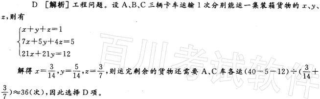 问题 A、B、C三辆卡车一起运输1次,正好能运完一集装箱的某种货物。现三辆卡车一起执行该种货物共40集装箱的运输任务,A运7次、B运5次、C运4次,正好运完5集装箱的量。此时C车休息,而A、B车各运了21次,又完成了12集装箱的量。问如果此后换为A、C两车同时运输,至少还需要各运多少次才能运完剩余的该种货物?( ) A. 30 B. 32 C. 34 D. 36