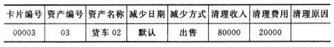 (用户名:101;账套:300;操作日期:2014年1月31日)固定资产减少。减少下列固定资产卡片,并生成凭证。(注:该固定资产原值10000元,已经计提折旧35500元,附件张数是1,凭证类型为:转账凭证,摘要为出售货车02)