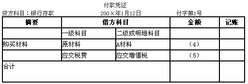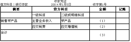 问题 请根据题目所述条件填列(1)-(5)处。 (1)甲企业200ⅹ年1月5日销售货物一批,价款10000元,增值税销项税率17%,收到购买单位支票一张,收讫后存入银行。出纳人员根据审核无误的原始凭证填制银行存款收款凭证。 (2)甲企业200ⅹ年1月12日购入A材料一批,买价6000元,增值税进项税率17%,开出支票一张支付购料款。出纳人员根据审核无误的原始凭证填制银行存款付款凭证。