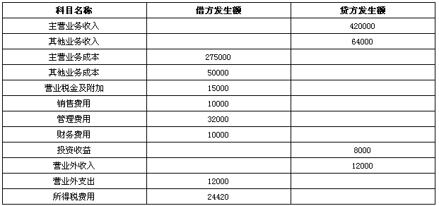 解析 (1)营业收入=主营业务收入+其他业务收入=420000+64000=484000; (2)投资收益=8000; (3)营业利润=营业收入-营业成本(主营业务成本+其他业务成本)-营业税金及附加-销售费用-管理费用-财务费用+投资收益=484000-325000-15000-10000-32000-10000+8000=100000; (4)利润总额=营业利润+营业外收入-营业外支出=100000+12000-12000=100000; (5)净利润=利润总额-所得税费用=100000-24420=75580。