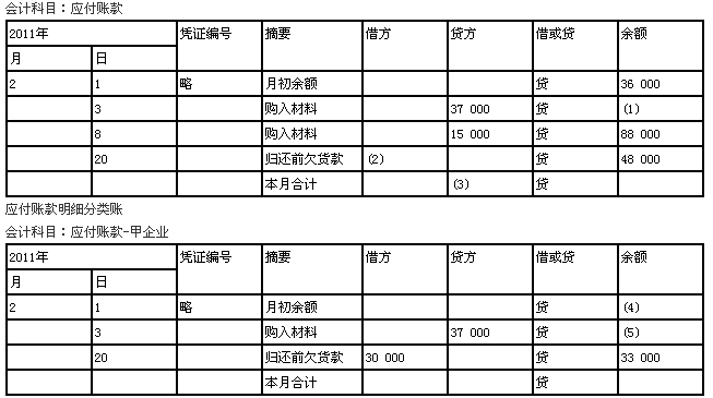 问题 2011年2月发生的经济业务及登记的总分类账和明细分类账如下: (1)3日,向甲企业购入A材料200公斤,单价80元,价款16 000元,购入B材料300公斤,单价70元,价款21 000元,材料已验收入库,款项尚未支付(不考虑税费); (2)8日,向乙企业购入A材料1 500公斤,单价10元,材料已验收入库,款项尚未支付; (3)12日,生产车间为生产产品领用材料,其中A材料1 200公斤,单价20元,领用B材料1 100公斤,单价30元; (4)20日,向甲企业偿还前欠货款30 000元,向乙企业偿还货款10 000元,以银行存款支付; (5)28日,向A企业购入B材料3 000公斤,单价20元,价款通过银行存款支付,材料已验收入库。
