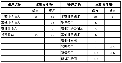 解析 1、“主营业务收入”和“其他业务收入”属于损益类收入类账户,贷方表示增加,借方表示减少。即主营业务收入4月末金额=51-2=49;其他业务收入4月末金额=13;根据“营业收入=主营业务收入+其他业务收入”得出“营业收入=49+13=62”。 2、“主营业务成本”和“其他业务成本”属于损益类账户,借方表示增加,贷方表示减少。即主营业务成本4月末金额=25-1=24;其他业务成本4月末金额=5;即“营业成本=主营业务成本+其他业务成本=24+5=29”。 3、“管理费用”属于损益类中费用类账户,即借方表示增加额,贷方表示减少额,即管理费用4月末金额=本期增加发生额-本期减少额=1-0.4=0.6。 4、营业利润=营业收入-营业成本-营业税金及附加-销售费用-管理费用-财务费用-投资损失=62-29-4-6-0.6-(2.5-0.5)-(14-10)=16.4。 5、利润总额=营业利润+营业外收入-营业外支出=16.4+2-1=17.4。