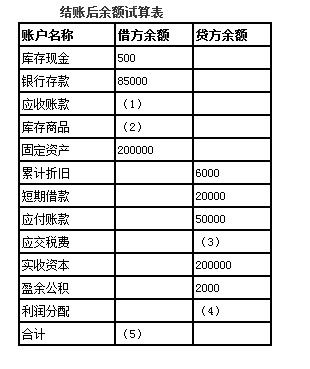 解析 业务一:“办公用”固定资产折旧,应计入到“管理费用”,会计分录为:借:管理费用 1000 贷:累计折旧 1000 业务二:结转成本,应编制的会计分录:借:主营业务成本 100000 贷:库存商品 100000 业务三:结转损益类账户至“本年利润”账户,其中收入结转至“本年利润”的贷方,成本和费用结转至“本年利润”的借方。会计分录为:借:主营业务收入 206000 贷:本年利润 206000 借:本年利润 131000 贷:主营业务成本 100000 销售费用 10000 管理费用 21000 (1)应收账款的本期没有变动,所以应收账款借方余额=45500(元);(2)根据业务二可知,库存商品借方余额=170000-100000=70000(元)。(3)根据业务三可知,本年利润=206000-131000=75000元,那么,应交所得税=75000*25%=18750(元);(4)根据第三(3)小题可知,利润分配=75000(本年利润)-18750(应交税费)+8000(利润分配期初余额)+40000(本年利润)=104250(元);(5)借方余额合计=500+85000+45500+70000+200000=401000(元)。