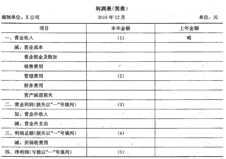 X公司12月份发生以下经济业务: (1)对外销售甲商品3500件,单价68元,增值税率l7%,货款已经收到。 (2)经批准处理财产清查中的账外设备一台,估计原价10000元,七成新。 (3)计算分配本月应付职工工资共计40000元。其中管理部门25000元,专设销售机构人员工资15000元。 (4)计提本月办公用固定资产折旧1200元。 (5)结转已销售的3500件甲商品的销售成本140000元。 (6)将本月实现的损益结转至“本年利润”账户。 假设12月份,“营业税金及附加”、“资产减值损失”、“财务费用”、“营业外收入”、“营业外支出”账户均没有发生额。 要求:根据上述资料,计算下表中(1)、(2)、(3)、(4)、(5)的金额,并写出业务(1)~(6)的会计分录。