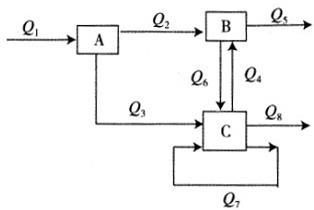 下图为某厂A、B、C三个车间的物料关系,下列物料衡量系统表达正确的是()。A:Q1=Q5+Q8 B:Q3+Q4=Q6+Q8 C:Q2+Q3=Q5+Q7...