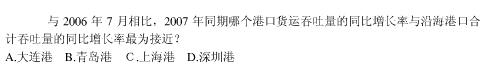解析 .[解析] 与2006年7月相比,2007年同期沿海港口合计吞吐量比例为32631÷27660≈1.18,四个选项中,大连比例为1804÷1626≈1.11,青岛港为2190÷1897≈1.15,上海为4180÷3950≈1.06,深圳为1605÷1526≈1.05,青岛港最接近,所以选B。