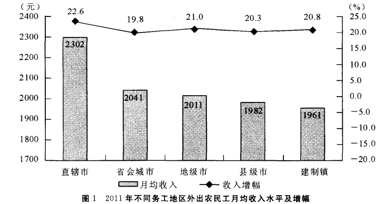 2011年,外出农民工月均收人2049元,比上年增加359元。分地区看,在东部地区务工 的农民工月均收人2053元,增长21.0%;在中部地区务工的农民工...