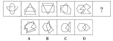 解析 所给出的每个图形均可看成由两个小图形组成,这提示我们将每个图形分成两个小图形来考虑。查看它们的线条数,依次是(1,2)、(2,3)、(3,4)、(4,5)、(6、7),相差均为1。选项中只有B项的两个小图形的线条数相差是1。