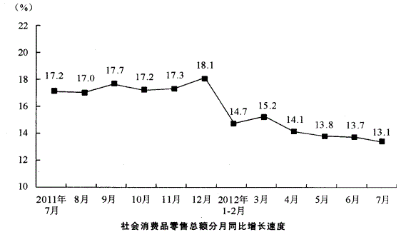 国家统计局发布的数据显示,2012年7月份,社会消费品零售总额16315亿元,同比名义增长13. 1%(扣除价格因素实际增长12. 2%,以下除特殊说明外...
