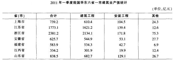 解析 2011年一季度,华东六省一市建筑业产值的平均值是(739.2+1773.1+2381.2+625.7+ 583.9+334.2+838.5)÷7=1039.4 亿元。