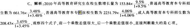 问题 2010年,全国各类高等教育总规模达到3105万人,高等教育毛入学率达到26.5%。全国共有普通高等学校和成人高等学校2723所,比上年增加34所。其中,普通高等学校2358所(含独立学院323所),比上年增加53所,成人高等学校365所,比上年减少19所。普通高校中本科院校1112所,比上年增加22所;高职(专科)院校1246所,比上年增加31所。全国共有培养研究生单位797个,其中高等学校481个,科研机构316个。 下列教育类别中,2010年人数增长最多的是()。 A.高等教育研究生在校生数 B.普通高等教育本专科招生数 C.普通高等教育本专科在校生数 D.成人高等教育本专科招生数