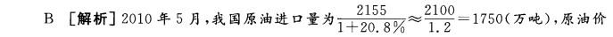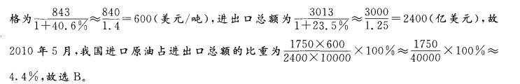 问题 根据以下资料, 2011年1一5月,全国进出口总额14018亿美元,同比增长27. 4%;其中,出口 7124亿美 元,增长25. 5%;进口 6894亿美元,增长29. 4%。 当月进、出口保持较快增长。5月份,全国进出口总额3013亿美元,同比增长23. 5%,环 比增长0.4%。其中,出口 1572亿美元,环比增长1%,同比增长19.4%,增速比上月回落 10. 5个百分点;进口 1441亿美元,环比下降0. 1 %,同比增长28. 4%,增速比上月加快6. 6个 百分点。 部分大宗原材料进口量比上月有所减少。5月份,进口原油2155万吨,同比增长20.8%; 天然橡胶12万吨,同比增长33. 3%;铁矿砂5330万吨,同比增长2. 9% ;未锻造铜及铜材25. 5 万吨,同比下降35. 8%;未锻造铝及铝材7.5万吨,同比下降20. 9%;氧化铝11万吨,同比下 降76. 1%。与上月相比,原油、铁矿砂进口量基本持平,其他产品进口量有不同程度减少。 1 一5月,累计进口原油1.07亿吨,同比增长11. 3%;进口铁矿砂2. 83亿吨,同比增长8. 1%; 进口煤5688万吨,同比减少16. 6%。 大宗商品进口价格小幅上涨。5月份,原油进口平均价格为843美元/吨,同比上涨 40. 6%;铁矿砂平均价格为167美元/吨,同比上涨27. 3%;天然橡胶平均价格为4969美元/吨, 同比上涨57. 7% ;未锻造铜及铜材、未锻造铝及铝材进口平均价格分别为9552美元/吨和5133美元/吨,同比上涨25. 8%和31. 2%;进口氧化铝平均价格为471美元/吨,同比上 涨 28.4%。 轻纺产品出口保持快速增长。5月份,纺织品、服装、鞋类出口额同比分别增长23.7%、 23. 9%和17. 7%;家具、箱包、塑料制品出口额分别增长3. 3%、31.7%和17. 7%;灯具、玩具 分别增长19. 2%和0.6%。 机电产品、高新技术产品出口平稳。5月份,机电产品、高新技术产品出口额分别为880 亿美元和429亿美元,分别占全国出口额的56%和27. 3%,同比分别增长14. 2%和8. 6%;与 一季度月均出口额相比,分别增长13. 8%和8.5%。其中,手机、自动数据处理设备及其部件 出口额分别增长12. 7%和2.9%,彩电出口额下降11. 9%。 2010年5月,我国进口原油占进出口总金额的比重为( )。 A. 6% B. 4. 4% C. 12. 6% D. 9. 5%