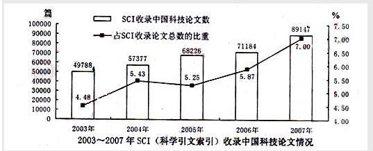 根据所给图表,回答.2003~2007年,SCI平均每年约收录多少篇中国科技论文? A.5.9万 B.6.3万 C.6.7万 D....