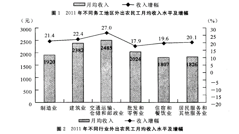 2011年,外出农民工月均收人2049元,比上年增加359元。分地区看,在东部地区务工 的农民工月均收人2053元,增长21.0%;在中部地区务工的农民工...