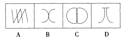 解析 从整体上很容易看出题干图形的对称性,且奇数项图形均为直线图形,不构成封闭区域进而发现偶数项图形均构成封闭区域,符合以上特征的图形是c。