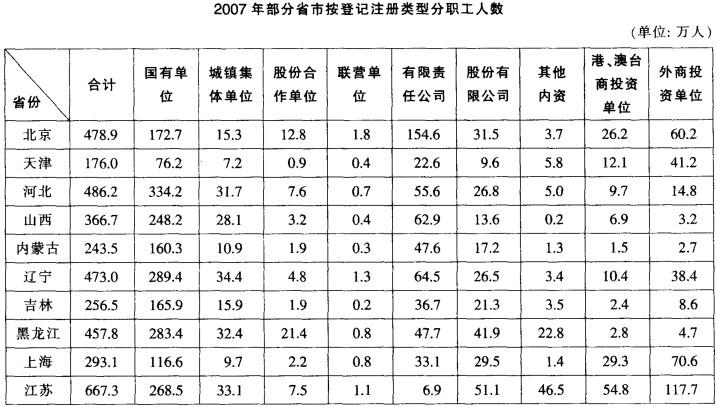 解析 内资单位职工总人数=职工总数-港、澳、台商投资单位职工数-外商投资单位职工数。2007年山西内资单位职工总数=366.7-6.9-3.2=356.6万人,黑龙江内资单位职工总数=457.8-2.8-4.7=450.3万人;356.6÷450.3= (350+6.6)÷(450+0.3)>350+450=77.8%,所以正确答案为 C。