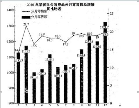 以下说法正确的是( )。A. 2009年该省社会消费品分月零售额最大的是12月份B. 2010年该省社会消费品分月零售额增幅最大的是12月...
