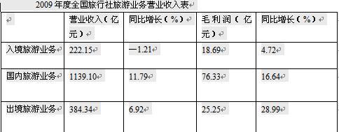 2009年度全国旅行社营业收入为1806.53亿元,同比增长8.64%;毛利润总额为134.36亿元,毛利率为7.44%;净利润总额为11.48亿元,净利...