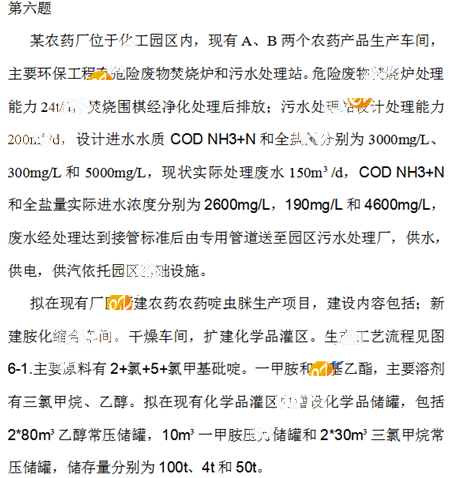 解析  参考答案:   1、废气G1的特征污染物:三氯甲烷、一甲胺   废气G5的特征污染物:粉尘、乙醇(对粉尘纠结了很久,但看贾老师去年答的有粉尘就写了,不知道是不是又错了)   2、不合理   经深冷凝后三氯甲烷的浓度高,不适合用碳纤维吸附处理,碳纤维吸附适用于风量大、浓度低的气体的处理;   3、不可行   (1)本项目废水W1的全盐量浓度为125000mg/l,大于厂区污水处理站全盐量进水浓度5000mg/l的要求;   (2)将本项目混合后进入污水处理站也不符合废水“分质分类”处理的要求,由于项目W1、W2、W3水质相差大,应将W1处理达厂区污水处理站进水浓度要求后方能进入,W2、W3可不处理直接进入;   4、(1)本项目固体废物的种类、成分、数量;   (2)焚烧炉焚烧的技术指标可行性;   (3)焚烧炉焚烧尾气净化措施的可行性;   (4)焚烧炉剩余处理能力的可行性。