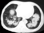女,34岁,新月体肾炎患者,最近咳嗽咯血,第一次行胸片检查考虑为双下肺感染,抗感染治疗后无明显好转,症状加重,4天后复查并行CT检查如图,应考虑为 ( )...