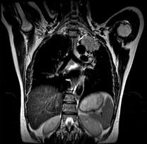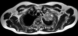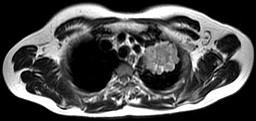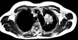 男,68岁,声音嘶哑半个月,行MRI检查如图,其最可能的诊断为 ( )A.右上肺癌B.左上肺结核球C.左上肺炎性假瘤D.左上肺...