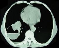 男,76岁,胸痛伴咳嗽,咯血低热1个月,CT检查如图,最可能的诊断为 ( )A.右下肺脓肿B.右下肺癌伴空洞形成C.右下肺囊肿D....