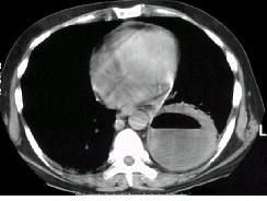 男,36岁,胸痛半月伴发高热,胸片发现占位性病变,CT检查如图,最可能的诊断为 ( )A.左下肺肺脓肿B.左下肺癌并空洞形成C.左侧胸...