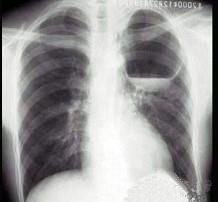 男,26岁,胸闷伴胸痛,胸片如图,最可能的诊断为 ( )A.左上肺空洞型结核B.左上肺脓肿C.左上肺液气囊肿D.左上肺包虫病E.韦格肉芽肿
