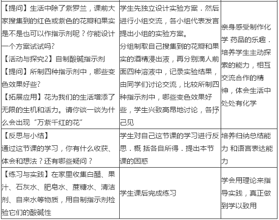 解析 知识点】化学教学设计能力——常见的酸和碱 (1)①从物质系统看,酸和碱是两大物质类别,化学性质丰富,且在生产、生活及科学研究中都有广泛的应用.学生应该对其有所了解。 ②酸和碱是生活中重要的物质,也是重要的工业原料。可利用酸和碱的性质精制产品。保证化学反应的适宜条件等。 ③酸和碱的学习丰富了学生对身边物质的认识,让学生对物质的认识方式从一种物质到一类物质。具有了初步推断物质性质的意识和能力。 (2)一、教学目标 ①知识与技能:认识紫色石蕊、酚酞这两种酸碱指示剂;会用酸碱指示剂检验溶液的酸碱性;能自制酸碱指示剂,并设计和完成有关的实验。 ②过程与方法:通过自制酸碱指示剂及用指示剂检验酸、碱溶液的探究活动,进一步体验科学探究的过程,学会运用实验的方法获取信息,运用比较、归纳、概括等方法对获取的信息进行加工。 ③情感态度与价值观:自制酸碱指示剂。并设计和完成有关的实验。进一步增强对化学现象的探究欲望,培养善于合作、勤于思考的科学精神,逐步树立认识来源于实践的观点。 二、教学方法 实验探究法、讲授法、讨论法。 三、教学过程