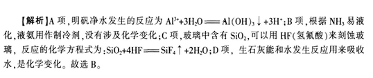 下列物质的使用不涉及化学变化的是( )。A.明矾用作净水剂 B.液氨用作制冷剂 C.氢氟酸刻蚀玻璃 D.生石灰用作干燥剂