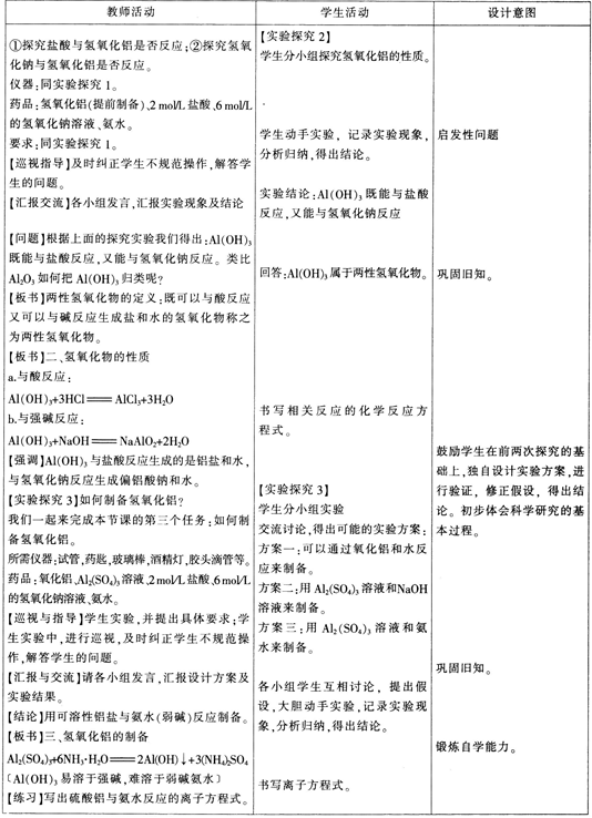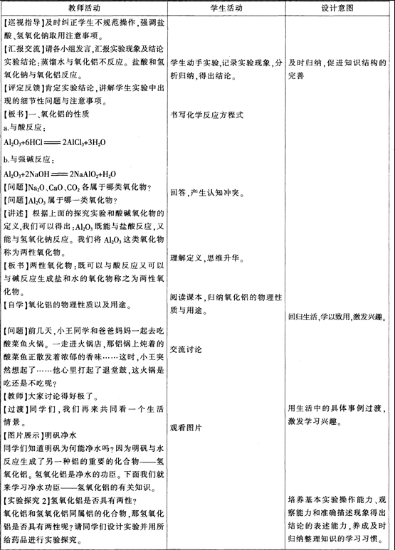 解析 (1)氢氧化钠溶液是强碱,能够溶解氢氧化铝沉淀。(2)教学目标 知识与技能:以氧化铝和氢氧化铝为代表掌握两性氧化物和两性氢氧化物的概念和化学性质;能够掌握一些基本的实验操作。 过程与方法:通过实验探究,认识氧化铝、氢氧化铝的性质及制备氢氧化铝的较优方法:培养观察能力。运用类比的方法认识事物和全面分析事物的逻辑思维能力及创新思维能力。 情感态度与价值观:通过实验探究,体验科学探究的艰辛与喜悦.感受化学世界的奇妙与和谐;激发学习化学的兴趣,深化对“化学是一门以实验为基础的科学”的认识。 教学方法 实验探究法。讲述法,讨论法。教学过程