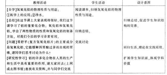 问题 阅读下列三段材料,根据要求完成任务。 材料一《普通高中化学课程标准(实验)》关于金属及其化合物的内容标准:根据生产、生活中的应用实例或通过实验探究,了解钠、铝、铁、铜等金属及其重要化合物的主要性质,能列举合金材料的重要应用。 材料二某版本高中实验教科书《化学l》“铝的重要化合物”的内容:二、铝的重要化合物 铝是地壳中含量最多的金属元素,但人们发现并制得单质铝却比较晚,这是由于铝很活泼.从铝的化合物中提炼铝单质比较困难。铝的许多化合物在人类的生产和生活中具有重要的作用。 1.氧化铝 我们已经知道,氧化铝难溶于水,熔点很高,也很坚固,因此覆盖在铝制品表面极薄的一层氧化铝就能有效地保护内层金属。氧化铝是冶炼金属铝的原料,也是一种比较好的耐火材料。 它可以用来制造耐火坩埚、耐火管和耐高温的实验仪器等。 氧化铝难溶于水,却能溶于酸或强碱溶液中。它溶于碱时,生成物是偏铝酸盐和水。因此,氧化铝是一种两性氧化物。 2.氢氧化铝【实验3-7】 在试管里加入l0 mL 0.5 mol/L Al2(S04)3溶液,滴加氨水,生成白色胶状物质。继续酒加氨水.直到不再产生沉淀为止。 反应中得到的白色胶状物质是氢氧化铝[AI(OH)3],它几乎不溶于水,但能凝聚水中的悬浮物.并能吸附色素。在实验室里,常常用铝盐溶液与氨水反应来制取氢氧化铝。 【实验3-8】 取一些上面实验中制得的AI(OH),沉淀,分装在2支试管里,往一支试管里滴加2 mol/L盐酸.往另一支试管里滴加2 mol/L NaOH溶液。边加边振荡,观察现象。 实验证明,AI(OH)3在酸或强碱溶液里都能溶解。这说明它既能与酸起反应,又能与强碱起反应.它是两性氢氧化物。 AI(OH)3是医用的胃酸中和剂中的一种,它的碱性不强,不至于对胃壁产生强烈的刺激或腐蚀作用,但却可以与酸反应,使胃液酸度降低,起到中和过多胃酸的作用。 加热时,AI(OH)3分解为氧化铝和水。 【学与问】 问题:为什么常用氨水与硫酸铝溶液反应制取氢氧化铝,而不用氢氧化钠溶液? 材料三教学对象为高中一年级学生,他们已经学习了必修化学1的“铝单质”“物质的分类”以及“离子反应”等知识。 要求: (1)回答材料二“学与问”中的问题。 (2)完成“铝的重要化合物’’的教学设计片段,内容包括教学目标、教学方法和教学过程。