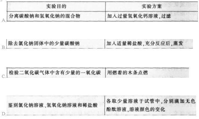 解析 A项,加入过量的氢氧化钙,引入了新的杂质氢氧化钙;8项,加人适量的HCl可以刚好把碳酸钠除去,生成氯化钠和水.将水蒸发掉即可得到纯净的氯化钠;C项,由于二氧化碳不支持燃烧,所以二氧化碳和少量一氧化碳的混合物是不能点燃的,即不能用点燃的方法检验一氧化碳是否存在:D项.氯化钠和稀盐酸遇酚酞均不变色.不能用酚酞溶液鉴别。