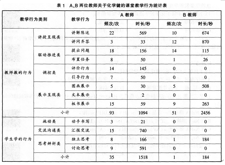 课堂教与学的行为是一个整体,教与学总是同时发生,相伴而行的。有学者观察了两位教师(A为专家型教师,B为新手型教师)关于“化学键”的课堂教学行为,并将所观察...