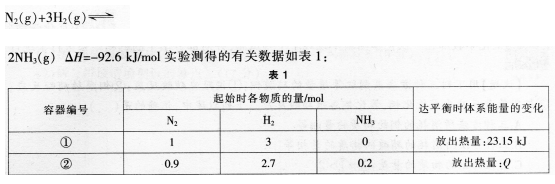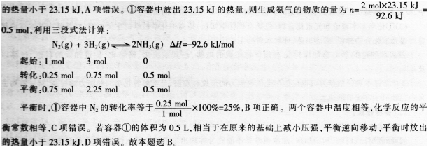 选项 A.容器②中达平衡时放出的热量Q=23.15kJ B.平衡时,①容器中N2的转化率为25% C.容器①和②中反应的平衡常数不相等 D.若容器①体积为0.5L,则平衡时放出的热量大于23.15KJ