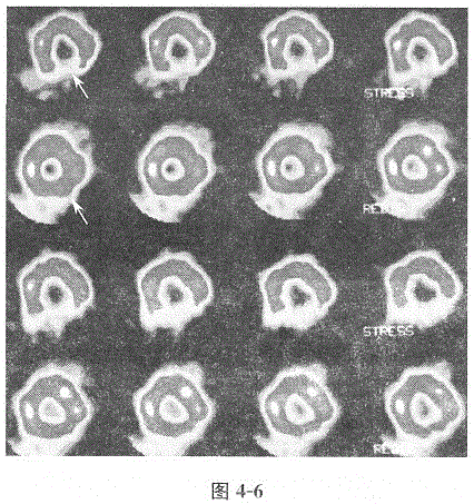 问题 五十二岁女性,胸闷,运动(stress)和静息(rest)心肌灌注显像图见图4-6。 此患者左心室下壁显像剂分布表现为