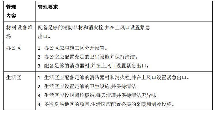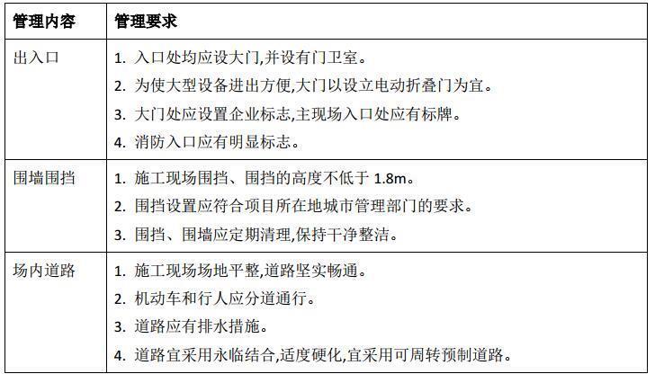 解析 场容管理措施 场容管理内容包含出入口、围墙围挡、场内道路、材料设备堆场、办公区、生活区、库房内环境。管理措施如下: