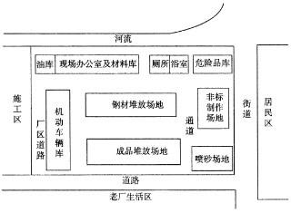 A公司总承包某地一扩建项目的机电安装工程,材料和设备由建设单位提供。A公司除自己承担主工艺线设备安装外,非标准件制作安装工程、防腐工程等均匀分包给具有相应施工资质的分包商施工。考虑到该地区风多雨少的气候,建设单位将紧靠河边及施工现场的一所弃用学校提供给A公司项目部,项目部安排两层教学楼的一层做材料工具工作,二楼作现场办公室,楼旁临河边修建简易厕所和浴室,污水直接排入河中,并对其他空地做了施工平面布置(见下图)。