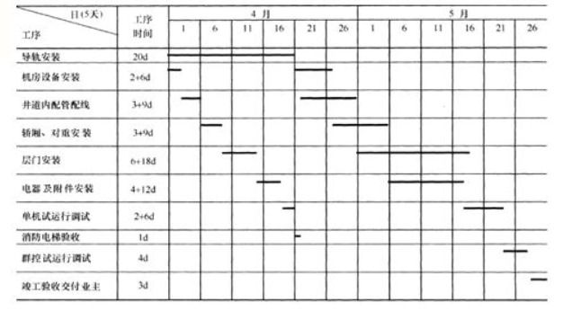 某安装公司承接一商务楼(地上30层、地下2层)的电梯安装工程,工程有32层32站曳引式电梯8台,工期为90天,开工时间为3月18日,其中6台客梯需智能群控...