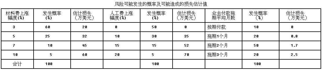 某国际工程合同总价为3000万美元,合同工期12个月,合同中无价格调整条款,承包商通过风险辨识认识到承包该工程主要面临三方面的风险,材料价格上涨,人工费上...