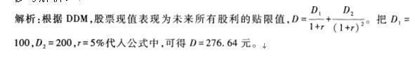 问题 假设股票A第一期支付股利为l00元,第二期支付股利为200元,贴现率为5%,根据股利贴现模型(DDM)计算该股票的现值为( )元。