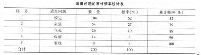 解析 采用排列图法列表计算质量问题的累计频率(6分): 主要质量问题:是咬边和夹渣。(1分)   次要质量问题:是气孔。(1分)   一般质量问题:是焊瘤和裂纹。(1分)