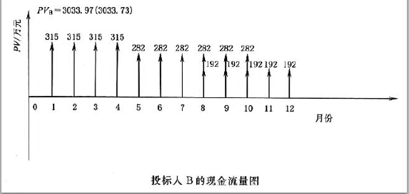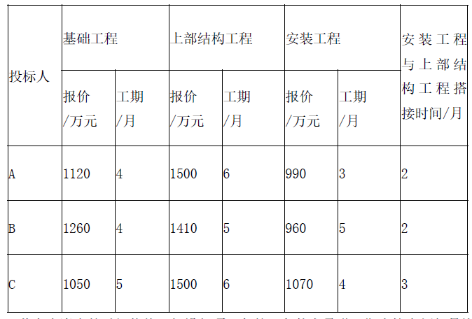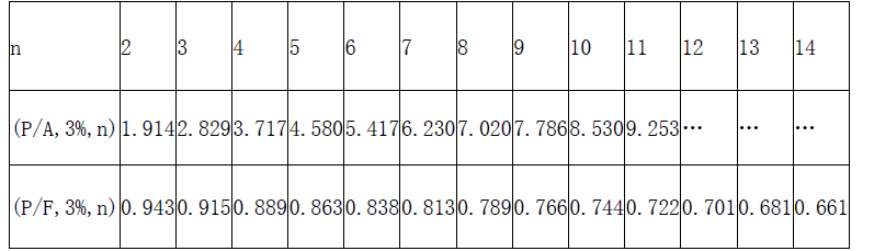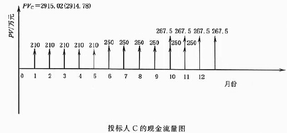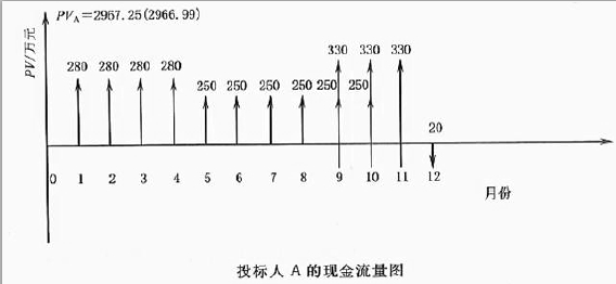 解析 问题1: 总工期=基础工程工期+上部结构工程工期+安装工程工期-搭接工期 不考虑资金的时间价值,计算各投标人经评审的投标价: (1)投标人A 的总报价为:1120+1500+990=3610(万元) 总工期为:4+6+3-2=11(月) 经评审的投标价PA=3610-20×(12-11)=3590(万元) (2)投标人B 的总报价为:1260+1410+960=3630(万元) 总工期为:4+5+5-2=12(月) 经评审的投标价PB=3630—20×(12-12)=3630(万元) (3)投标人C 的总报价为:1050+1500+1070=3620(万元) 总工期为:5+6+4-3=12(月) 经评审的投标价PC=3620—20×(12-12)=3620(万元) (4)按经评审的投标价由低到高排序:A (3590 万元)、C(3620 万元)、B(3630 万元)。 因此,若不考虑资金的时间价值,应选择排名第一的投标人A 作为中标人。 问题2: 若考虑资金的时间价值,计算各投标人经评审的投标价的现值(计算结果保留整数): (1)计算投标人A 经评审的投标价的现值PVA: 基础工程每月工程款A1A=1120÷4=280(万元) 上部结构工程每月工程款A2A=1500÷6=250(万元) 安装工程每月工程款A3A=990÷3=330(万元) 工期提前每月收益A4A=20(万元) 安装工程的开工月份4+6-2=8(月) 解法一: PVA=A1A(P/A,3%,4)+A2A(P/A,3%,6)(P/F,3%,4)+A3A(P/A,3%,3)(P/F,3%,8)–A4A(P/F,3%,12) =280×3.717+250×5.417×0.889+330×2.829×0.789-20×0.701=2967(万元) 解法二: PVA=A1A(P/A,3%,4)+A2A(P/A,3%,4)(P/F,3%,4)+(A2A+A3a)(P/A,3%,2)(P/F,3%,8)+A3A(P/F,3%,11)-A4A(P/F,3%,12) =280×3.717+250×3.717×0.889+(250+330) ×1.914×0.789+330×0.722-20×0.701=2967(万元) (2)计算投标人B 经评审的投标价的现值PVB 基础工程每月工程款A1B=1260÷4=315(万元) 上部结构工程每月工程款A2B=1410÷5=282(万元) 安装工程每月工程款A3B=960÷5=192(万元) 工期未提前,每月收益A4B=0(万元) 安装工程的开工月份4+5-2=7(月) 解法一: PVB=A1B(P/A,3%,4)+A2B(P/A,3%,5)(P/F,3%,4)+A3b(P/A,3%,5)(P/F,3%,7) =315X3.717+282X4.580X0.889+192X4.580X0.813 =3034(万元) 解法二: PVB=A1B(P/A,3%,4)+A2b(P/A,3%,3)(P/F,3%,4)+(A2B+A3b)(P/A,3%,2)(P/F,3%,7)+A3b(P/A,3%,3) (P/F,3%,9) =315×3.717+282×2.829×0.889+(282+192) ×1.914×0.813+192×2.829×0.766 =3034(万元) (3)计算投标人C 经评审的投标价的现值PVc : 基础工程每月工程款A1C=1050÷5=210(万元) 上部结构工程每月工程款A2C=1500÷6=250(万元) 安装工程每月工程款A3C=1070÷4=267.5(万元) 工期未提前,每月收益A4C=0(万元) 安装开始月份5+8-3=11(月) 解法一: PVc=A1c(P/A,3%,5)+A2C(P/A,3%,6)(P/F,3%,5)+A3C(P/A,3%,4)(P/F,3%,8) =210×4.580+250×5.417×0.863+267.5×3.717×0.789 =2915(万元) 解法二: PVc=A1c(P/A,3%,5)+A2c(P/A,3%,3)(P/F,3%,5)+(A2C+A3C)(P/A,3%,3)(P/F,3%,8)+A3C(P/F,3%,12) =210×4.580+250×2.829×0.863+(250+267.5) ×2.829×0.789+267.5×0.701 =2915(万元) (4)按经评审的投标价由低到高排序:C(2915 万元)、A(2967 万元)、B(3034 万元)。因此,若考虑资金的时间价值,应选择排名第一的投标人C 作为中标人。