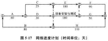 某工程项目,业主通过招标与甲建筑公司签订了土建工程施工合同,包括A、B、C、D、E、F、G、H八项工作,合同工期为3 60天。业主与乙安装公司签订了设备安装施工合同,包括设备安装与调试工作,合同工期1 80天。通过相互协调,编制了如图5-1 7所示的网络进度计划。该工程施工过程中发生了以下事件:事件1:基础工程施工时,业主负责供应的钢筋混凝土预制桩供应不及时,使A工作延误7天。事件2:B工作施工后进行检查验收时,发现一预埋件埋置位置有误。经核查,是由于设计图纸中预埋件位置标注错误所致。甲建筑公司进行了返工处理,损失5万元,且使B工作延误1 5天。事件:甲建筑公司因人员与机械调配问题造成C工作增加工作时间5天,窝工损失2万元。