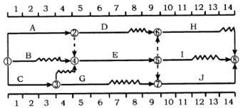 解析 本题考查的是双代号时标网络计划工作总时差和自由时差的判定。工作的总时差:(1)以终点节点为完成节点的工作,其总时差应等于计划工期与本工作最早完成时间之差;(2)其他工作的总时差等于其紧后工作的总时差加本工作与该紧后工作之间的时间间隔所得之和的最小值。据此计算,工作H的总时差为1周,工作I的总时差为3周,工作J的总时差为0,则工作E的总时差为0,所以工作B的总时差为0+2=2周。B工作的自由时差为该工作箭线中波形线的水平投影长度,即为2周。